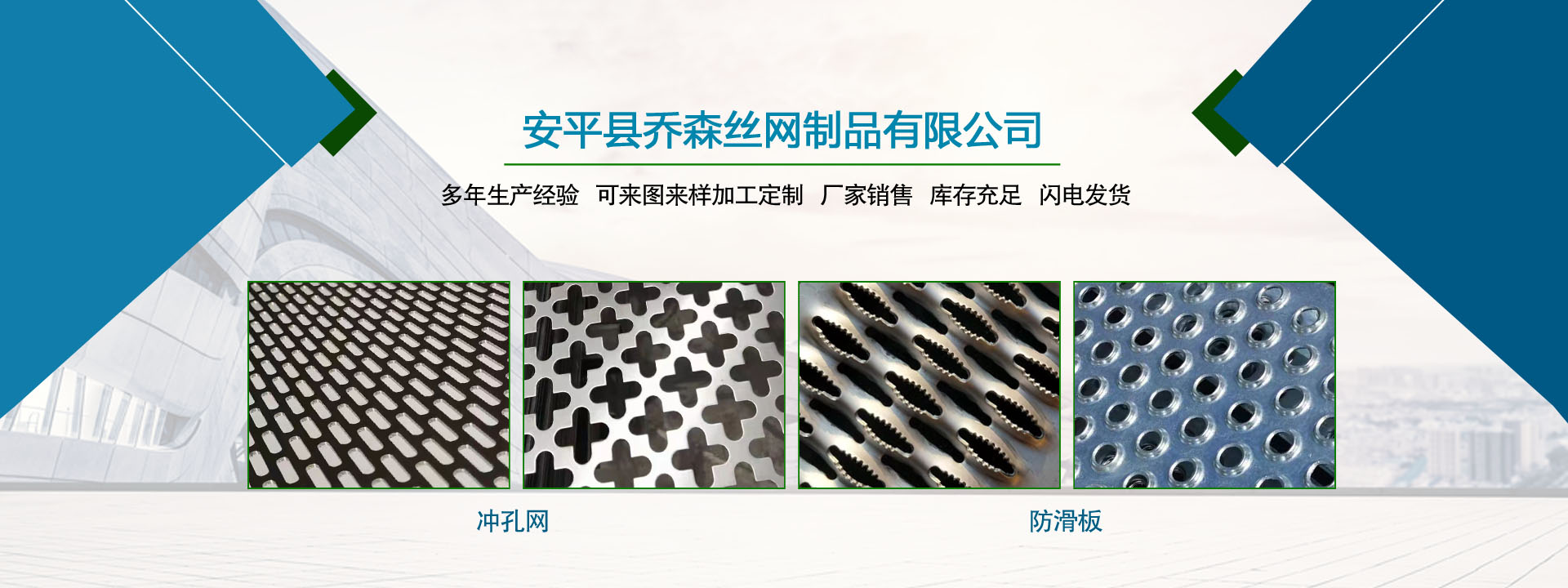 安平縣喬森絲網(wǎng)制品有限公司主營(yíng)產(chǎn)品:篩網(wǎng)、金屬裝飾網(wǎng)、沖孔網(wǎng)板、防滑板和軋花網(wǎng)。常年現(xiàn)貨供應(yīng)45號(hào)黑鋼絲編織篩網(wǎng)、熱鍍鋅鋼絲篩網(wǎng)、304不銹鋼篩網(wǎng)和冷鍍鋅鐵絲網(wǎng),加工定做耐磨65號(hào)錳鋼絲篩網(wǎng)、菱形孔防堵篩網(wǎng)、養(yǎng)殖用長(zhǎng)方孔鐵絲網(wǎng)、金屬裝飾網(wǎng)、盤(pán)條